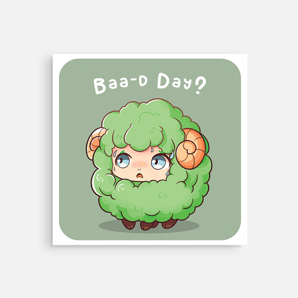 Sometimes, you just have one of those days! This 148 x 148mm postcard from our "Aminals Furm" collection features Winston, a fluffy green sheep looking decidedly uneasy. The playful text "Baa-D Day?" adds a touch of lightheartedness to a relatable feeling. Send this card to a friend who needs a little pick-me-up or a reminder that tough days happen. Printed on quality cardstock and includes a matching envelope. Share a moment of understanding with Winston!