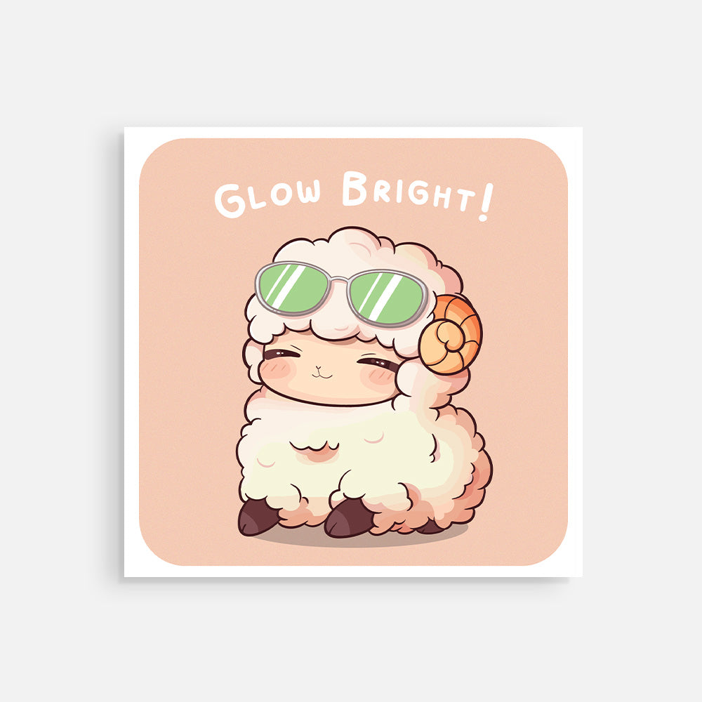 Send a dose of positive vibes with this fun 148 x 148mm postcard featuring Cotton from our "Aminals Furm" series! This fluffy sheep sporting cool sunglasses and the uplifting message "Glow Bright!" is sure to bring a smile to anyone's face. Perfect for sending encouragement, congratulations, or just a bit of cheerful mail. This high-quality postcard comes complete with a matching envelope. Brighten someone's day with Cotton!